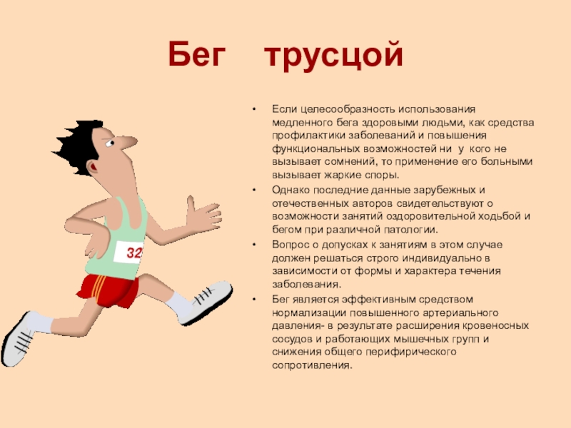 Бег является эффективным средством нормализации повышенного артериального давления- в результате расширения кровеносных сосудов и работающих мышечных групп и снижения общего перифирического сопротивления.