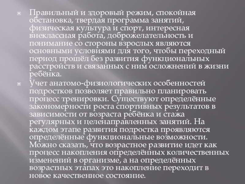 Учет анатомо-физиологических особенностей подростков позволяет правильно планировать процесс тренировки. Существуют определённые закономерности роста спортивных результатов в зависимости от возраста ребёнка и стажа регулярных и целенаправленных занятий. На каждом этапе развития подростка проявляются определённые функциональные возможности. Можно сказать, что возрастное развитие идет как процесс накопления определённых количественных изменений в организме, а на определённых возрастных этапах это накопление переходит в новое качественное состояние.