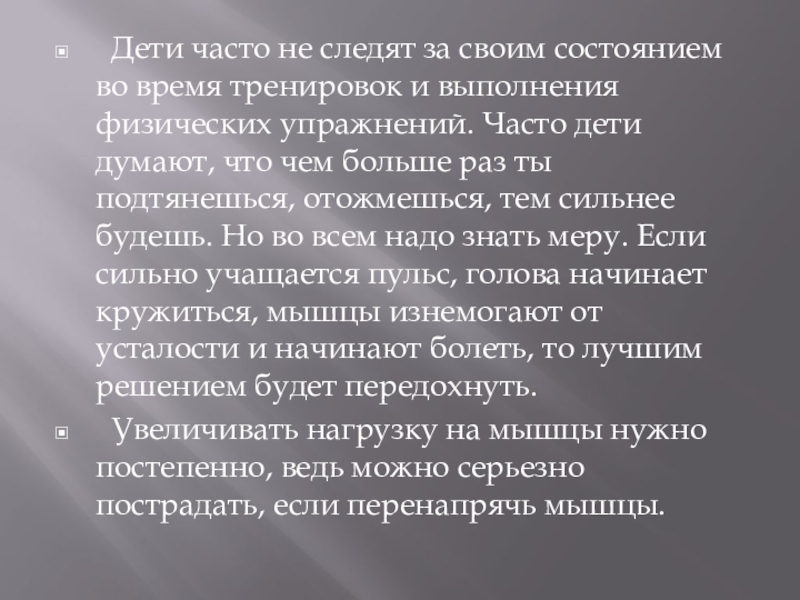и выполнения физических упражнений. Часто дети думают, что чем больше раз ты подтянешься, отожмешься, тем сильнее будешь. Но во всем надо знать меру. Если сильно учащается пульс, голова начинает кружиться, мышцы изнемогают от усталости и начинают болеть, то лучшим решением будет передохнуть.