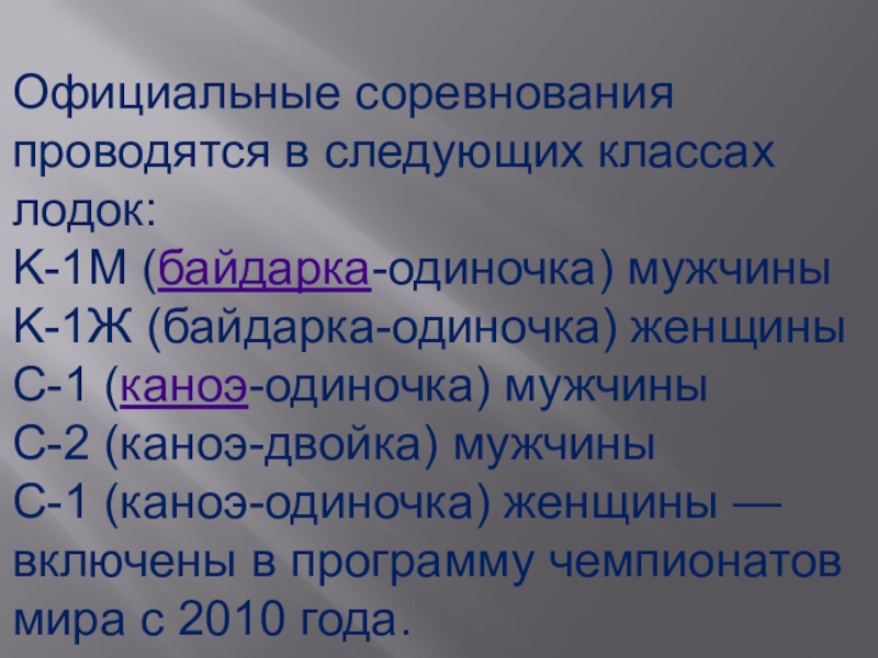 Слайд 11Официальные соревнования проводятся в следующих классах лодок: