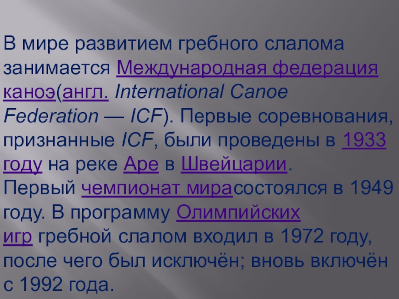 Слайд 9В мире развитием гребного слалома занимается Международная федерация каноэ(англ. International Canoe Federation — ICF).