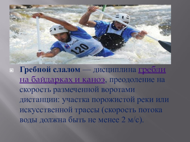 Слайд 2Гребной слалом — дисциплина гребли на байдарках и каноэ, преодоление на скорость размеченной