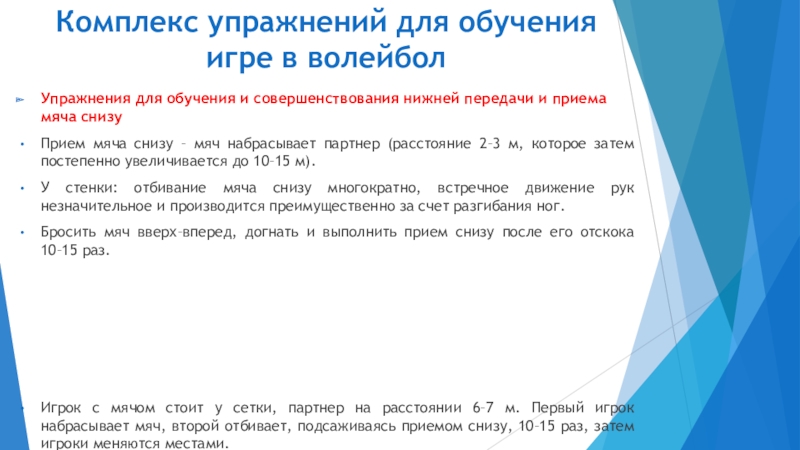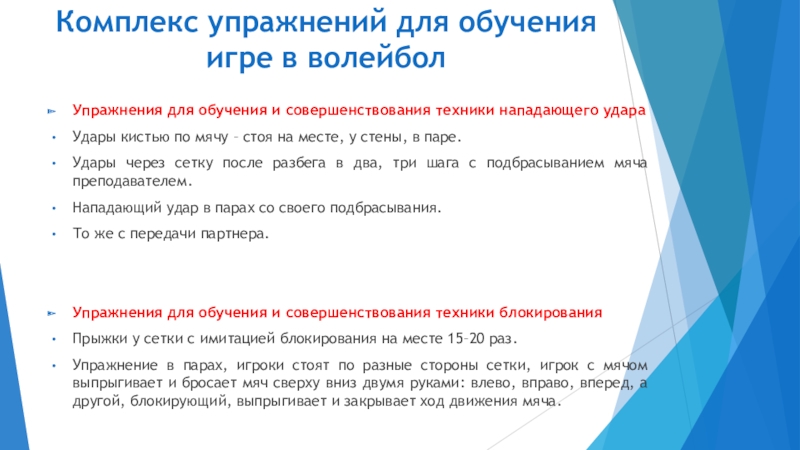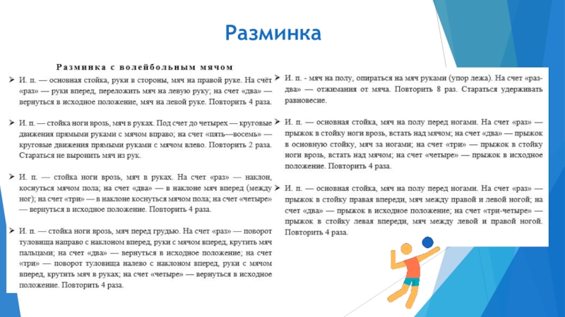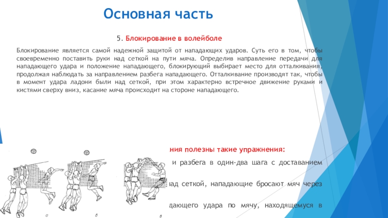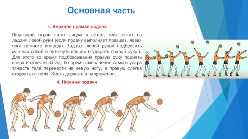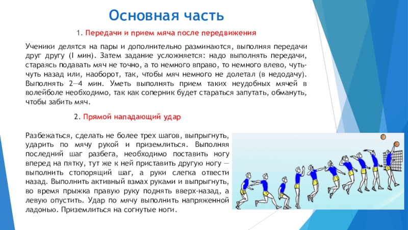 Разбежаться, сделать не более трех шагов, выпрыгнуть, ударить по мячу рукой и приземлиться. Выполняя последний шаг разбега, необходимо поставить ногу вперед на пятку, тут же к ней приставить другую ногу — выполнить стопорящий шаг, а руки слегка отвести назад. Выполнить активный взмах руками и выпрыгнуть, во время прыжка правую руку поднять вверх-назад, а левую опустить. Удар по мячу выполнить напряженной ладонью. Приземлиться на согнутые ноги.