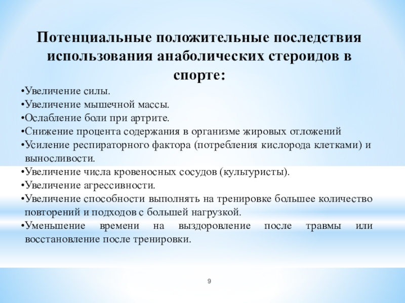 Слайд 9Потенциальные положительные последствия использования анаболических стероидов в спорте: