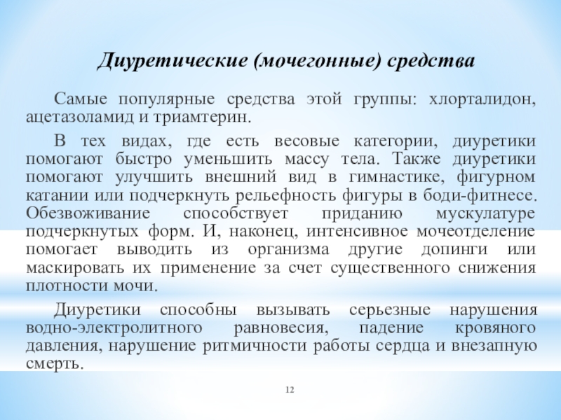В тех видах, где есть весовые категории, диуретики помогают быстро уменьшить массу тела. Также диуретики помогают улучшить внешний вид в гимнастике, фигурном катании или подчеркнуть рельефность фигуры в боди-фитнесе. Обезвоживание способствует приданию мускулатуре подчеркнутых форм. И, наконец, интенсивное мочеотделение помогает выводить из организма другие допинги или маскировать их применение за счет существенного снижения плотности мочи.