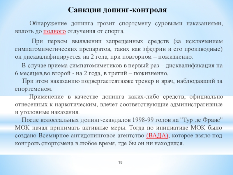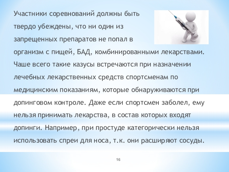 организм с пищей, БАД, комбинированными лекарствами. Чаше всего такие казусы встречаются при назначении лечебных лекарственных средств спортсменам по медицинским показаниям, которые обнаруживаются при допинговом контроле. Даже если спортсмен заболел, ему нельзя принимать лекарства, в состав которых входят допинги. Например, при простуде категорически нельзя использовать спреи для носа, т.к. они расширяют сосуды.