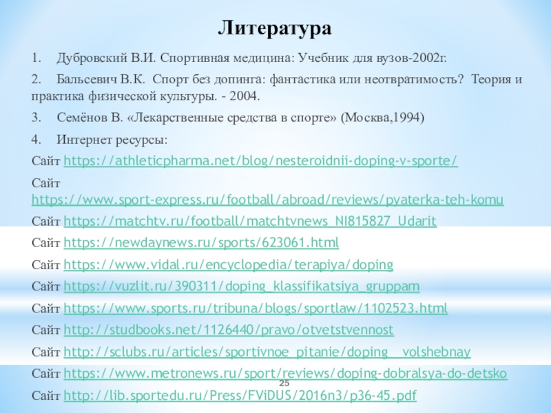 1. Дубровский В.И. Спортивная медицина: Учебник для вузов-2002г.