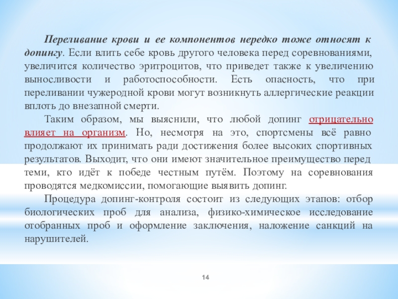 Слайд 14 Переливание крови и ее компонентов нередко тоже относят к допингу. Если
