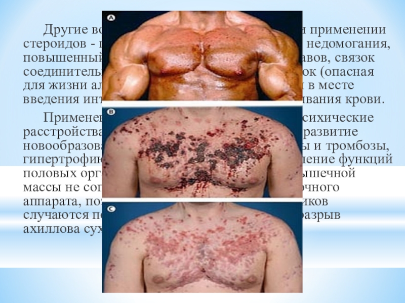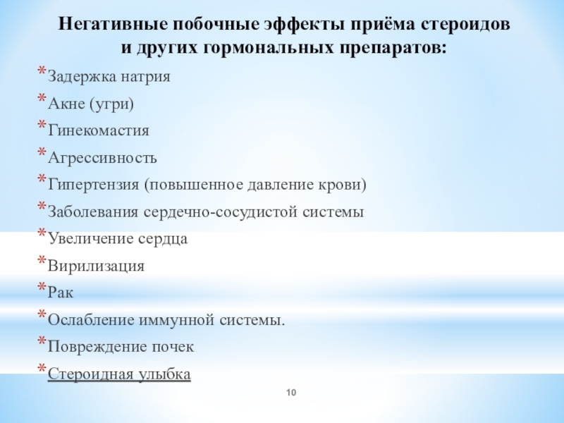 Слайд 10Негативные побочные эффекты приёма стероидов и других гормональных препаратов: