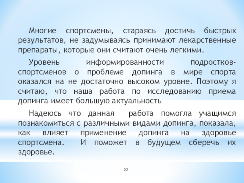 Слайд 22 Многие спортсмены, стараясь достичь быстрых результатов, не задумываясь принимают лекарственные препараты,