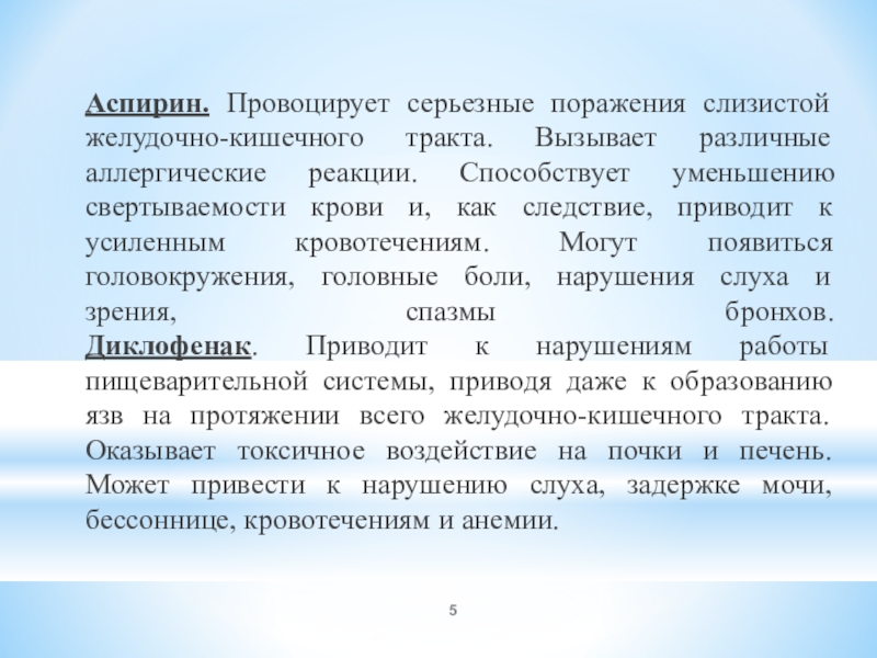 Аспирин. Провоцирует серьезные поражения слизистой желудочно-кишечного тракта. Вызывает различные аллергические реакции.