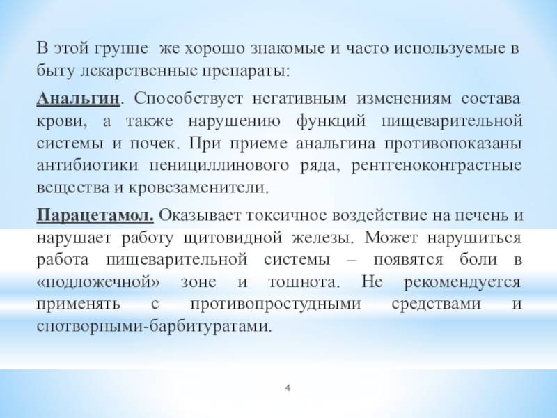 Анальгин. Способствует негативным изменениям состава крови, а также нарушению функций пищеварительной системы и почек. При приеме анальгина противопоказаны антибиотики пенициллинового ряда, рентгеноконтрастные вещества и кровезаменители.
