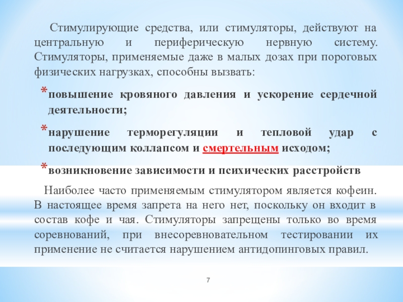 нервную систему. Стимуляторы, применяемые даже в малых дозах при пороговых физических нагрузках, способны вызвать: