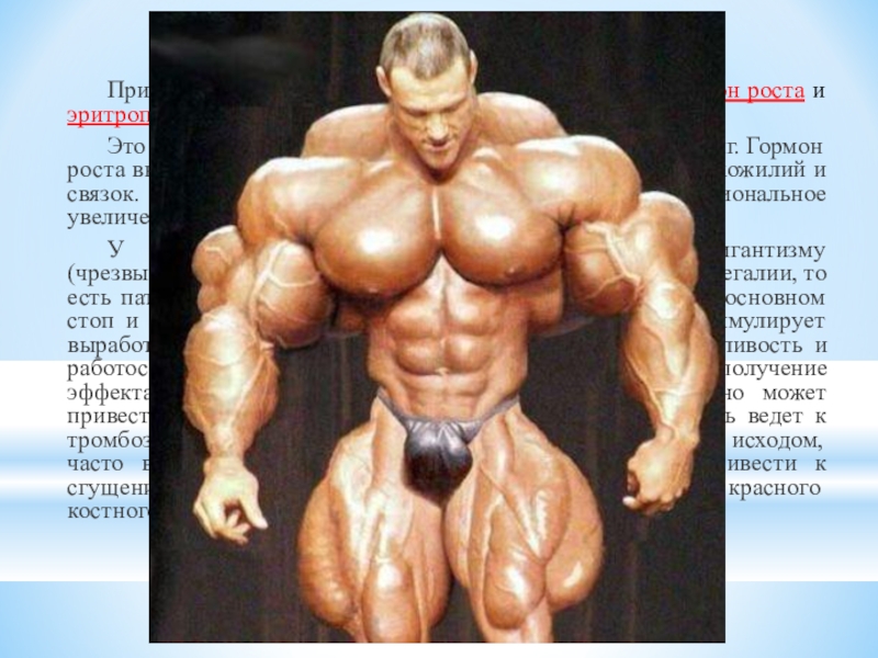 У молодых людей гормон роста приводит к гигантизму (чрезвычайно высокому росту в целом), у взрослых — к акромегалии, то есть патологическому увеличению некоторых частей тела, в основном стоп и кистей. Эритропоэтин, продуцируемый почками, стимулирует выработку и созревание эритроцитов, что повышает выносливость и работоспособность. Его употребление рассчитано на получение эффекта длительных тренировок в высотных условиях, но может привести к повышенной вязкости крови, что в свою очередь ведет к тромбозу кровеносных сосудов и инфаркту со смертельным исходом, часто во время сна. При длительном приеме может привести к сгущению крови, инфаркту, инсульту или даже опухоли красного костного мозга.