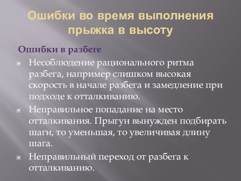 рационального ритма разбега, например слишком высокая скорость в начале разбега и замедление при подходе к отталкиванию.