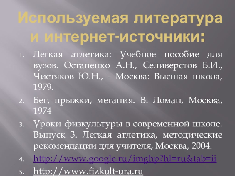 Уроки физкультуры в современной школе. Выпуск 3. Легкая атлетика, методические рекомендации для учителя, Москва, 2004.