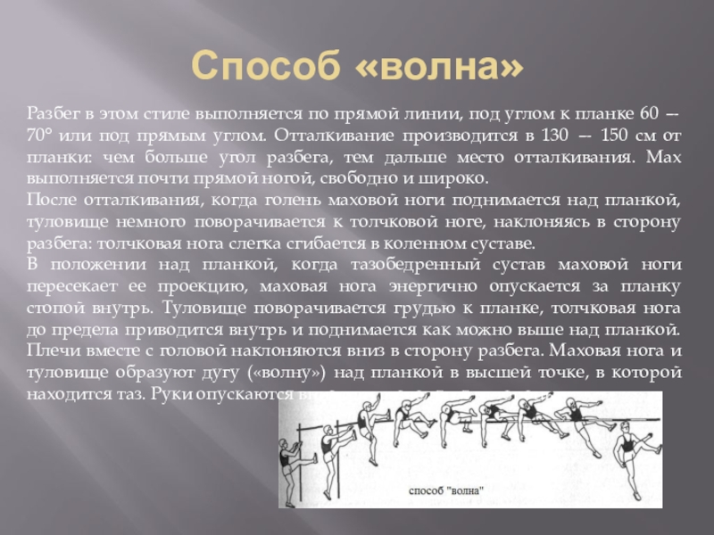 прыжков в высоту: «волна», «перекат», «перешагивание», «перекидной» и «фосбери-флоп». Способ «перешагивание» менее эффективен, хотя этот способ наиболее прост в техническом отношении и поэтому чаще используется на начальной стадии обучения прыжка в высоту. Способ «перешагивание» так же используют при обучении прыжка в высоту в школе.