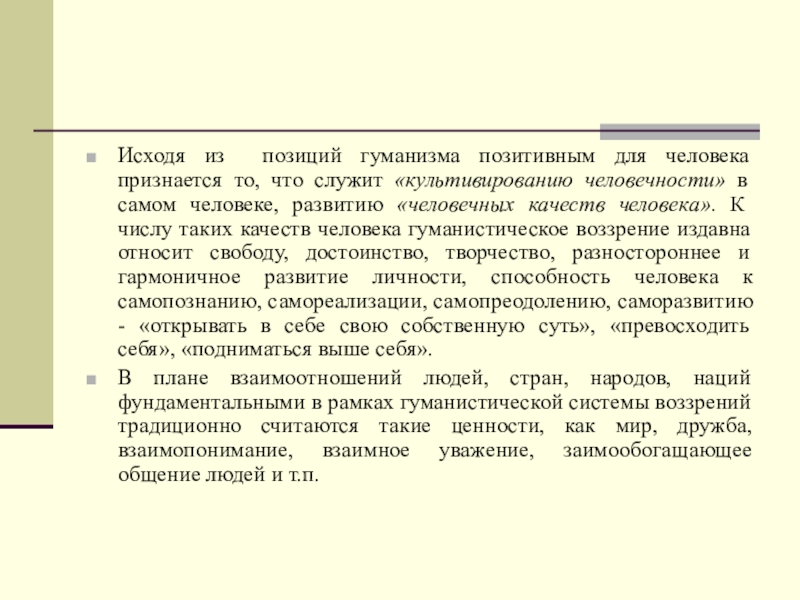 «культивированию человечности» в самом человеке, развитию «человечных качеств человека». К числу таких качеств человека гуманистическое воззрение издавна относит свободу, достоинство, творчество, разностороннее и гармоничное развитие личности, способность человека к самопознанию, самореализации, самопреодолению, саморазвитию - «открывать в себе свою собственную суть», «превосходить себя», «подниматься выше себя».