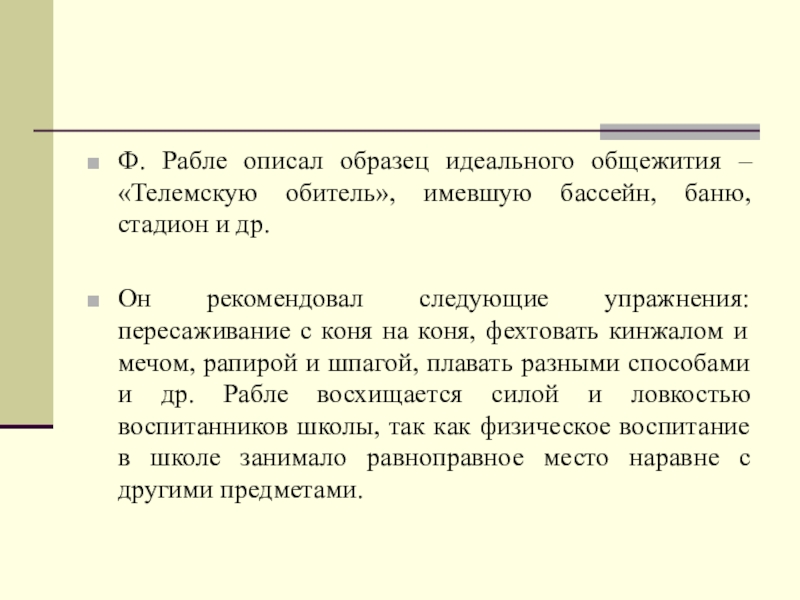 Ф. Рабле описал образец идеального общежития – «Телемскую обитель», имевшую бассейн,