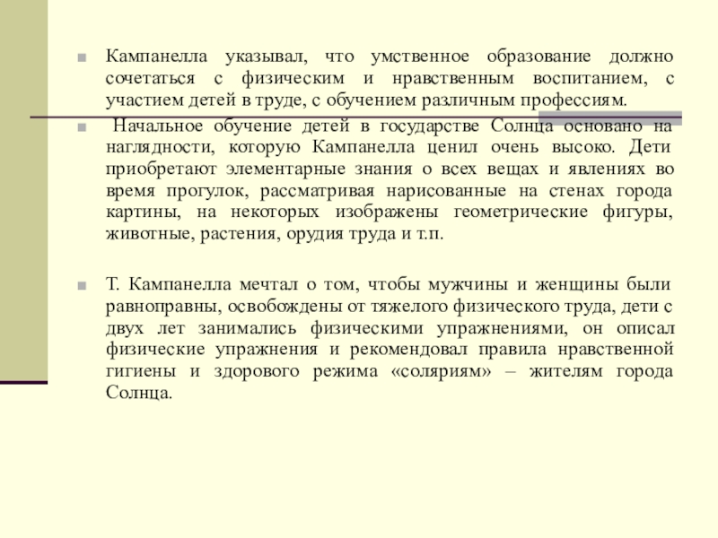 Кампанелла указывал, что умственное образование должно сочетаться с физическим и нравственным