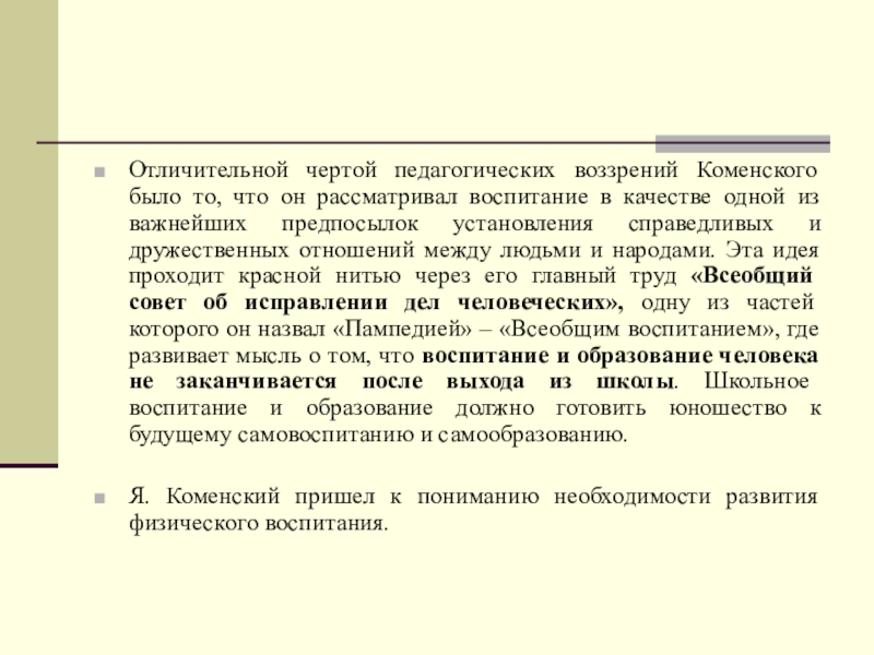 в качестве одной из важнейших предпосылок установления справедливых и дружественных отношений между людьми и народами. Эта идея проходит красной нитью через его главный труд «Всеобщий совет об исправлении дел человеческих», одну из частей которого он назвал «Пампедией» – «Всеобщим воспитанием», где развивает мысль о том, что воспитание и образование человека не заканчивается после выхода из школы. Школьное воспитание и образование должно готовить юношество к будущему самовоспитанию и самообразованию.