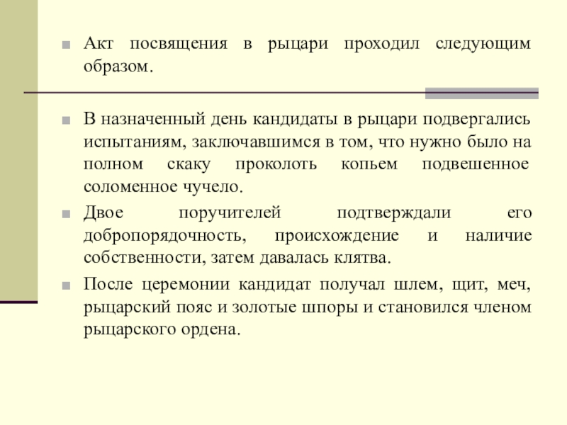 Акт посвящения в рыцари проходил следующим образом.