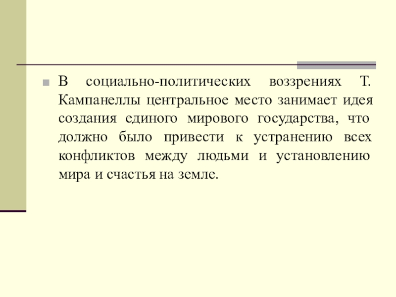 В социально-политических воззрениях Т. Кампанеллы центральное место занимает идея создания единого