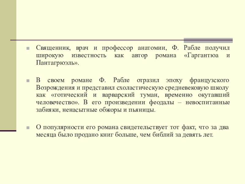 Священник, врач и профессор анатомии, Ф. Рабле получил широкую известность как