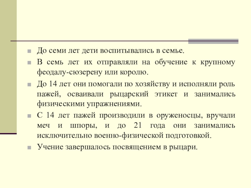 До 14 лет они помогали по хозяйству и исполняли роль пажей, осваивали рыцарский этикет и занимались физическими упражнениями.