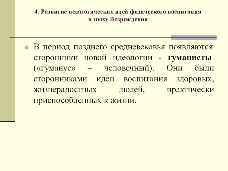 появляются сторонники новой идеологии - гуманисты («гуманус» – человечный). Они были сторонниками идеи воспитания здоровых, жизнерадостных людей, практически приспособленных к жизни.