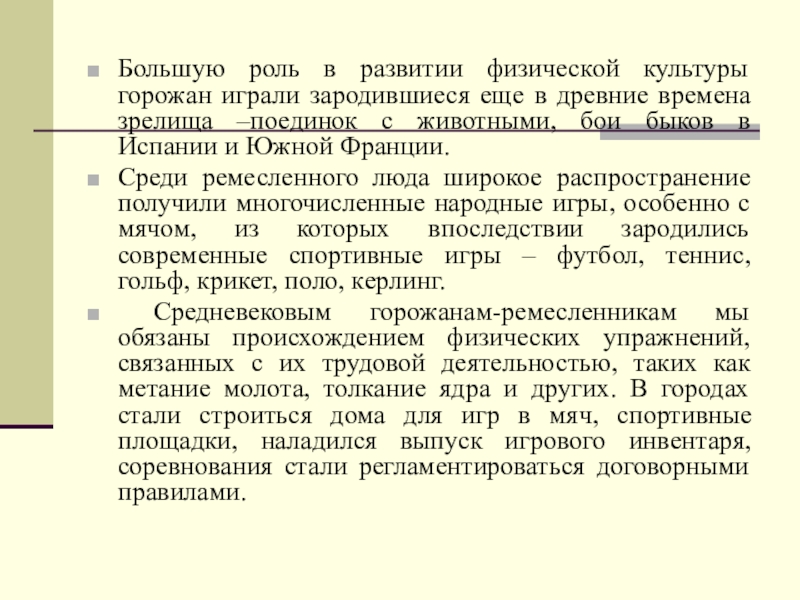 Средневековым горожанам-ремесленникам мы обязаны происхождением физических упражнений, связанных с их трудовой деятельностью, таких как метание молота, толкание ядра и других. В городах стали строиться дома для игр в мяч, спортивные площадки, наладился выпуск игрового инвентаря, соревнования стали регламентироваться договорными правилами. Все это свидетельствовало о зарождении в средневековых городах элементов современного спорта.