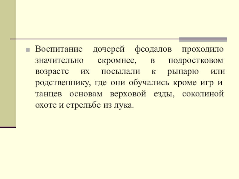 Воспитание дочерей феодалов проходило значительно скромнее, в подростковом возрасте их посылали