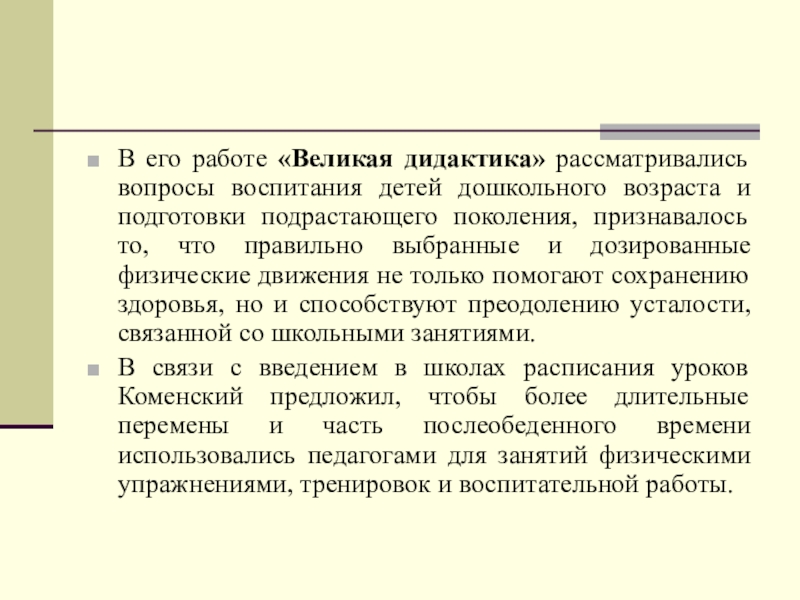 В его работе «Великая дидактика» рассматривались вопросы воспитания детей дошкольного возраста