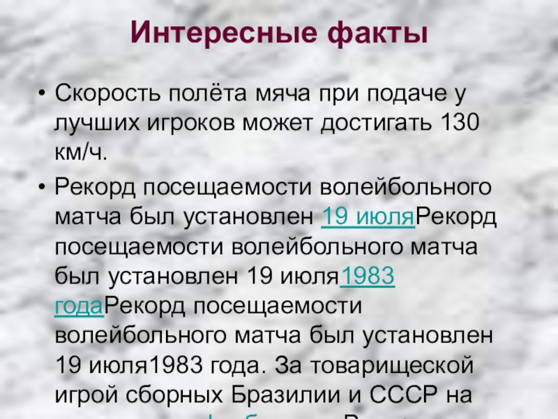 Рекорд посещаемости волейбольного матча был установлен 19 июляРекорд посещаемости волейбольного матча был установлен 19 июля1983 годаРекорд посещаемости волейбольного матча был установлен 19 июля1983 года. За товарищеской игрой сборных Бразилии и СССР на знаменитом футбольномРекорд посещаемости волейбольного матча был установлен 19 июля1983 года. За товарищеской игрой сборных Бразилии и СССР на знаменитом футбольном стадионе «Маракана» наблюдали 96 500 зрителей].