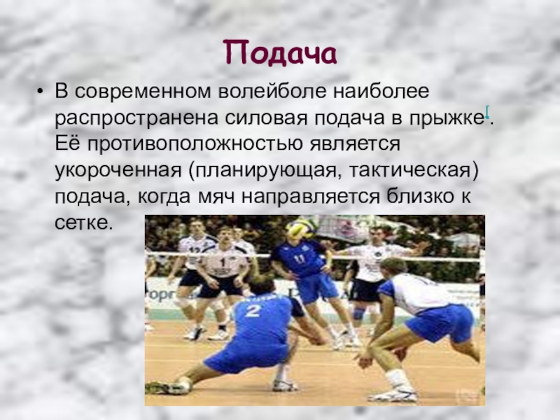 В современном волейболе наиболее распространена силовая подача в прыжке[. Её противоположностью