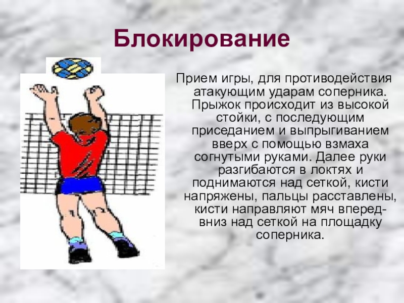 Прием игры, для противодействия атакующим ударам соперника. Прыжок происходит из