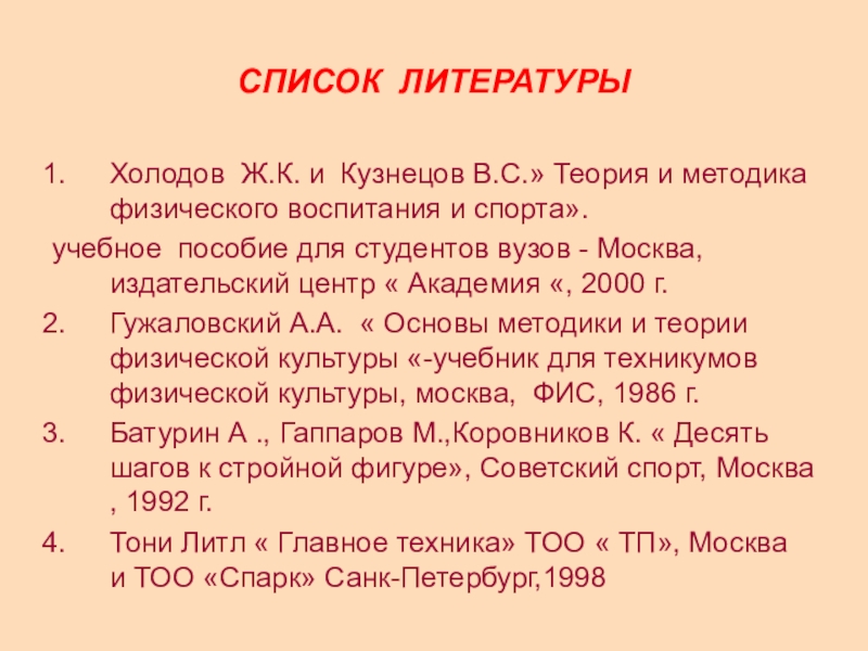 Гужаловский А.А. « Основы методики и теории физической культуры «-учебник для техникумов физической культуры, москва, ФИС, 1986 г.