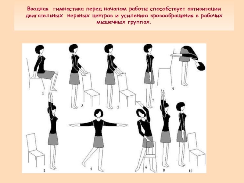 Слайд 11Вводная гимнастика перед началом работы способствует активизации двигательных нервных центров и