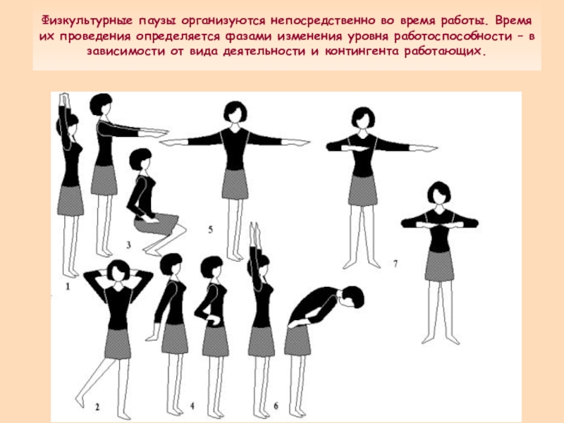 Слайд 13Физкультурные паузы организуются непосредственно во время работы. Время их проведения определяется