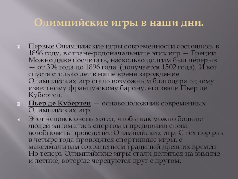 Этот человек очень хотел, чтобы как можно больше людей занимались спортом и предложил снова возобновить проведение Олимпийских игр. С тех пор раз в четыре года проводятся спортивные игры, с максимальным сохранением традиций древних времен. Но теперь Олимпийские игры стали делиться на зимние и летние, которые чередуются друг с другом.