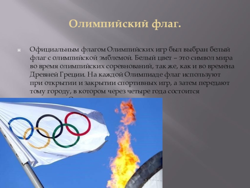 эмблемой. Белый цвет – это символ мира во время олимпийских соревнований, так же, как и во времена Древней Греции. На каждой Олимпиаде флаг используют при открытии и закрытии спортивных игр, а затем передают тому городу, в котором через четыре года состоится следующая Олимпиада.
