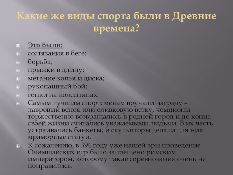 К сожалению, в 394 году уже нашей эры проведение Олимпийских игр было запрещено римским императором, которому такие соревнования очень не понравились.