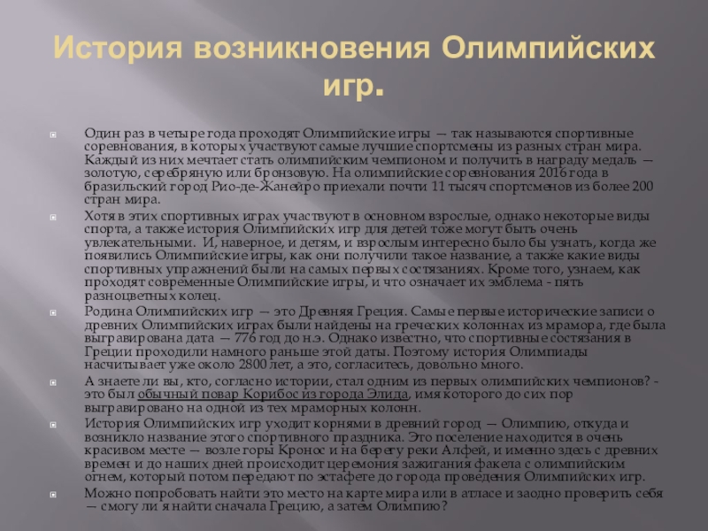 Хотя в этих спортивных играх участвуют в основном взрослые, однако некоторые виды спорта, а также история Олимпийских игр для детей тоже могут быть очень увлекательными. И, наверное, и детям, и взрослым интересно было бы узнать, когда же появились Олимпийские игры, как они получили такое название, а также какие виды спортивных упражнений были на самых первых состязаниях. Кроме того, узнаем, как проходят современные Олимпийские игры, и что означает их эмблема - пять разноцветных колец.
