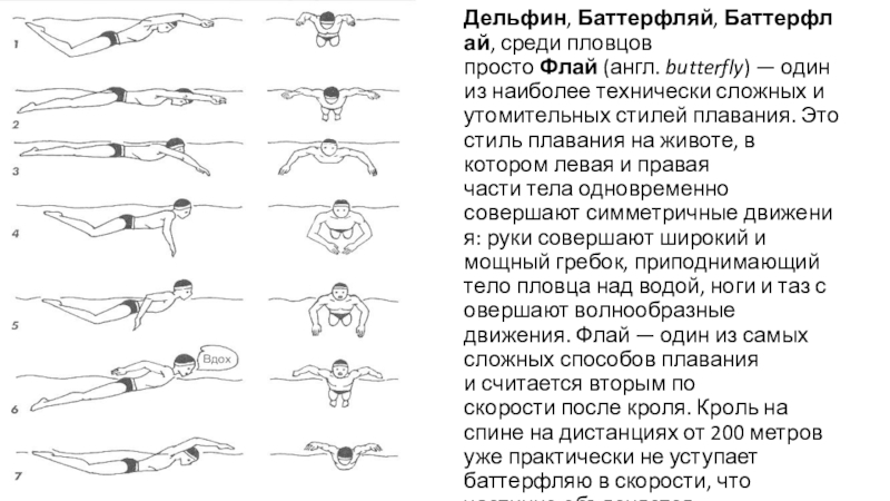 В конце 1933 года Генри Майерс плавал подобием баттерфляя в соревновании в Центральном Бруклине ИМКА. Баттерфляй развивался из брасса. Дэвид Армбрустер, тренер по плаванию в университете штата Айова, исследовал брасс. В 1934 Армбрустер усовершенствовал метод для выдвижения рук вперед над водой при брассе. Он назвал новый стиль «Баттерфляй». Несмотря на то, что стиль труден, в нем наблюдается значительное улучшение в скорости. Один год спустя, в 1935, Джек Зиг, пловец также из Университета штата Айова, разработал технику удара, связанную с плаванием на спине и биением ногами в унисон, подобно хвосту рыбы, а затем изменил технику чтобы плавать лицом вниз. Он назвал это стилем дельфин - как удар рыбьего хвоста. Армбрустер и Зиг быстро обнаружили, что сочетание этих техник создают очень быстрый стиль плавания.