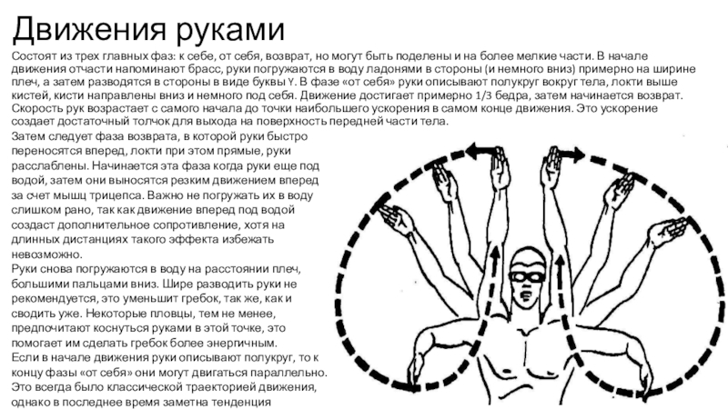Если в начале движения руки описывают полукруг, то к концу фазы «от себя» они могут двигаться параллельно. Это всегда было классической траекторией движения, однако в последнее время заметна тенденция совершать только большой полукруг по всей длине движения руками.