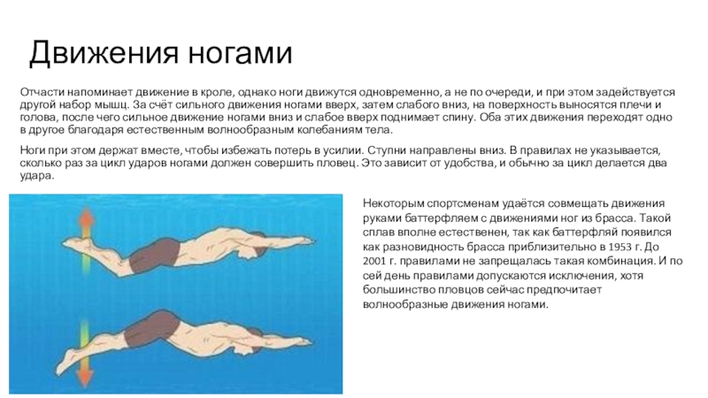 Некоторым спортсменам удаётся совмещать движения руками баттерфляем с движениями ног из брасса. Такой сплав вполне естественен, так как баттерфляй появился как разновидность брасса приблизительно в 1953 г. До 2001 г. правилами не запрещалась такая комбинация. И по сей день правилами допускаются исключения, хотя большинство пловцов сейчас предпочитает волнообразные движения ногами.