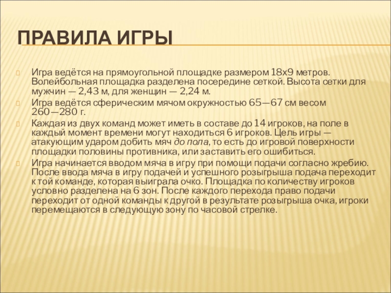 сеткой. Высота сетки для мужчин — 2,43 м, для женщин — 2,24 м.