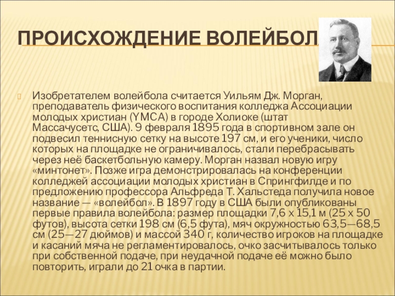 молодых христиан (YMCA) в городе Холиоке (штат Массачусетс, США). 9 февраля 1895 года в спортивном зале он подвесил теннисную сетку на высоте 197 см, и его ученики, число которых на площадке не ограничивалось, стали перебрасывать через неё баскетбольную камеру. Морган назвал новую игру «минтонет». Позже игра демонстрировалась на конференции колледжей ассоциации молодых христиан в Спрингфилде и по предложению профессора Альфреда Т. Хальстеда получила новое название — «волейбол». В 1897 году в США были опубликованы первые правила волейбола: размер площадки 7,6 x 15,1 м (25 x 50 футов), высота сетки 198 см (6,5 фута), мяч окружностью 63,5—68,5 см (25—27 дюймов) и массой 340 г, количество игроков на площадке и касаний мяча не регламентировалось, очко засчитывалось только при собственной подаче, при неудачной подаче её можно было повторить, играли до 21 очка в партии.