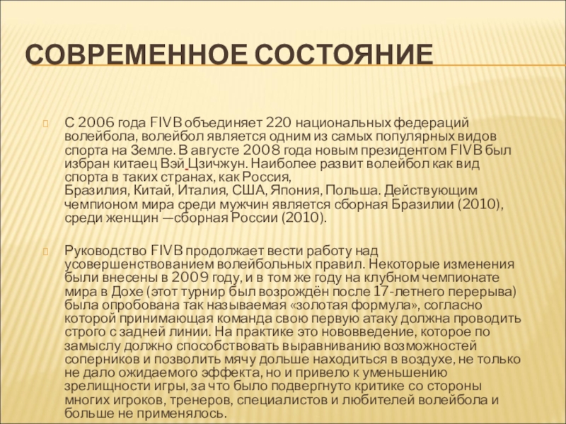 из самых популярных видов спорта на Земле. В августе 2008 года новым президентом FIVB был избран китаец Вэй Цзичжун. Наиболее развит волейбол как вид спорта в таких странах, как Россия, Бразилия, Китай, Италия, США, Япония, Польша. Действующим чемпионом мира среди мужчин является сборная Бразилии (2010), среди женщин —сборная России (2010).