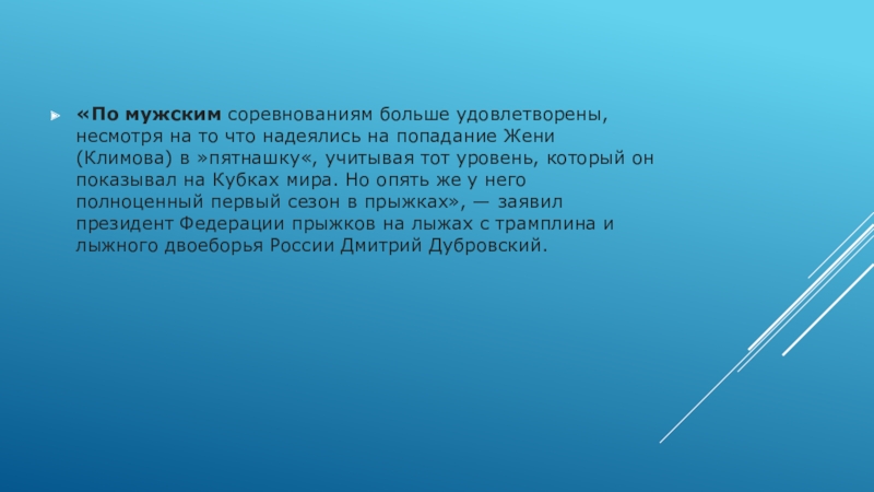попадание Жени (Климова) в »пятнашку«, учитывая тот уровень, который он показывал на Кубках мира. Но опять же у него полноценный первый сезон в прыжках», — заявил президент Федерации прыжков на лыжах с трамплина и лыжного двоеборья России Дмитрий Дубровский.